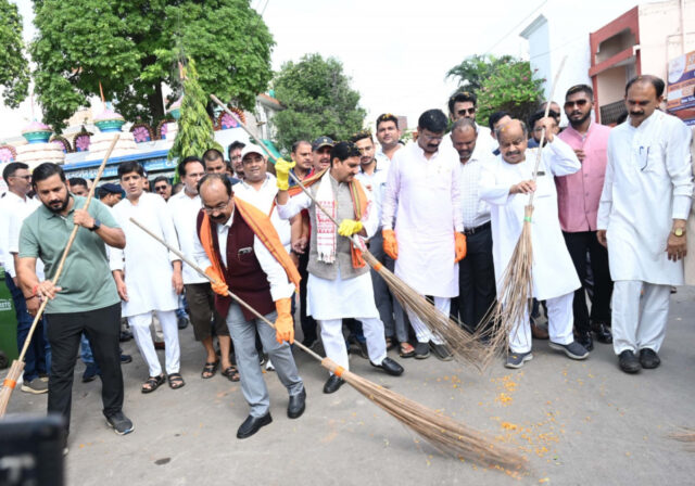 उप मुख्यमंत्री श्री अरुण साव तथा केंद्रीय आवासन और शहरी कार्य राज्य मंत्री श्री तोखन साहू ने आज ‘स्वच्छता ही सेवा’ पखवाड़ा के अंतर्गत श्रमदान किया। उन्होंने रायपुर के गायत्री नगर स्थित जगन्नाथ मंदिर परिसर में झाड़ू लगाकर सफाई की। उन्होंने इस मौके पर आयोजित कार्यक्रम में सफाई कर्मचारियों को सम्मानित किया। कार्यक्रम में मौजूद लोगों को अपने आसपास के परिवेश को स्वच्छ रखने और साफ-सफाई में सहभागिता की शपथ भी दिलाई गई। रायपुर-उत्तर के विधायक श्री पुरंदर मिश्रा भी कार्यक्रम में शामिल हुए।