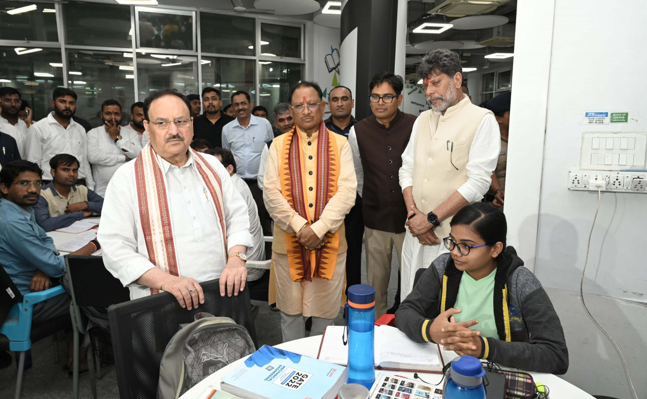 केंद्रीय स्वास्थ्य एवं परिवार कल्याण मंत्री श्री जगत प्रकाश नड्डा रायपुर प्रवास के दौरान आज शाम मुख्यमंत्री श्री विष्णुदेव साय एवं वित्तमंत्री श्री ओ. पी. चौधरी के साथ नालंदा परिसर पहुंचे। उन्होंने वहां लाइब्रेरी में विभिन्न प्रतियोगी परीक्षाओं की तैयारी कर रहे युवाओं से संवाद किया। श्री नड्डा ने यूपीएससी, सीजीपीएससी सहित अन्य भर्ती परीक्षाओं की तैयारी के लिए नालंदा लाइब्रेरी में अध्ययन की हाईटेक सुविधा, बैठक व्यवस्था एवं सकारात्मक वातावरण की तारीफ की। केंद्रीय मंत्री श्री नड्डा ने रायपुर में नालंदा परिसर को उसके नाम के अनुरूप स्थापित करने के लिए मुख्यमंत्री श्री विष्णुदेव साय एवं वित्तमंत्री श्री ओ.पी. चौधरी की सराहना की। श्री नड्डा ने नालंदा लाइब्रेरी से आरएफआईडी के माध्यम से पुस्तक इश्यू होने की प्रक्रिया का अवलोकन किया। उन्होंने युवाओं से संवाद करते हुए उनके द्वारा प्रतियोगी परीक्षा की तैयारियों के बारे में भी जानकारी ली।
