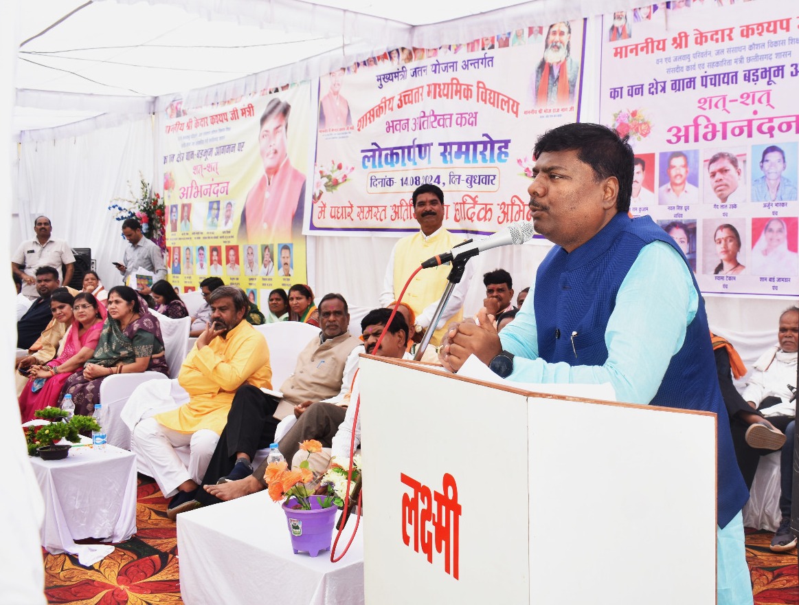 श्री कश्यप ने कार्यक्रम में उपस्थित लोगों एवं आम जनता से ’हर घर तिरंगा’ अभियान के अंतर्गत 15 अगस्त को स्वतंत्रता दिवस के अवसर पर अपने-अपने घरों पर अनिवार्य रूप से ध्वजारोहण करने की भी अपील की। इसके अलावा उन्होेंने प्रधानमंत्री श्री नरेन्द्र मोदी के आव्हान पर ’एक पेड़ माँ के नाम’ अभियान के अंतर्गत अपने-अपने घरों में अनिवार्य रूप से पौधारोपण कर अपनी माता की भाँति उसका समुचित देखभाल सुनिश्चित करने को कहा। कार्यक्रम को सम्बोधित करते हुए पूर्व विधायक श्री प्रीतम साहू ने वन मंत्री श्री केदार कश्यप और उनके पिता पूर्व मंत्री स्वर्गीय श्री बलिराम कश्यप के द्वारा ग्राम बड़भूम तथा वनांचल क्षेत्रों के विकास हेतु किए गए अनेक विकास कार्यों का भी उल्लेख किया।