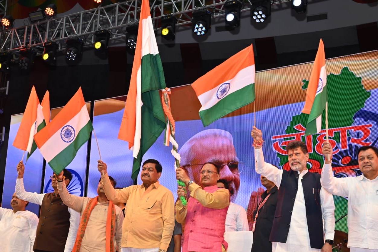 मुख्यमंत्री श्री विष्णु देव साय की मौजूदगी में आज राजधानी रायपुर के इंडोर स्टेडियम में जोहार तिरंगा कार्यक्रम का भव्य आयोजन किया गया है। संस्कृति विभाग द्वारा आयोजित इस कार्यक्रम में देश के मशहूर गायक श्री कैलाश खेर एवं साथियों ने देशभक्ति गीतों की सुरमयी प्रस्तुति दी। राष्ट्रीय गीत ‘वन्दे मातरम्‘ और ‘जान है हमारी है तिरंगा‘ गीत पर मुख्यमंत्री श्री विष्णु देव साय सहित उपस्थित लोगों ने देशभक्ति भाव से ओतप्रोेत होकर सुर से सुर मिलाया। मुख्यमंत्री श्री विष्णु देव साय द्वारा इससे पूर्व ‘जोहार तिरंगा‘ कार्यक्रम का शुभारंभ दीप प्रज्ज्वलन और छत्तीसगढ़ महतारी के छाया चित्र पर माल्यार्पण कर किया गया।