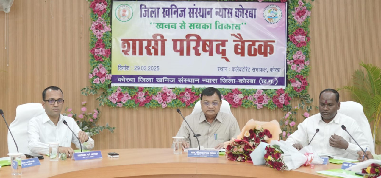 छत्तीसगढ़ शासन के वाणिज्य उद्योग एवं श्रम मंत्री श्री लखनलाल देवांगन के मुख्य आतिथ्य में आज कलेक्ट्रेट सभाकक्ष में जिला खनिज संस्थान न्यास की शासी परिषद की बैठक आयोजित हुई। बैठक में वित्तीय वर्ष 2024-25 में किए गए कार्यो की प्रगति एवं आगामी वित्तीय वर्ष 2025-26 के कार्ययोजना की स्वीकृति हेतु अनुमोदन किया गया। इस दौरान विधायक कटघोरा श्री प्रेमचंद पटेल, विधायक पाली-तानाखार क्षेत्र श्री तुलेश्वर सिंह मरकाम, विधायक रामपुर श्री फूल सिंह राठिया, जिला पंचायत अध्यक्ष डॉ पवन कुमार सिंह, महापौर श्रीमती संजू देवी राजपूत सहित अन्य सदस्य एवं पदेन अध्यक्ष कलेक्टर श्री अजीत वसंत, वनमण्डलाधिकारी कटघोरा श्री कुमार निशांत, आयुक्त नगर निगम श्री आशुतोष पाण्डेय, जिला पंचायत सीईओ श्री दिनेश नाग, अपर कलेक्टर श्री मनोज बंजारे, एसडीएम कोरबा श्री सरोज महिलांगे सहित अन्य जनप्रतिनिधि एवं विभागीय अधिकारी उपस्थित थे।