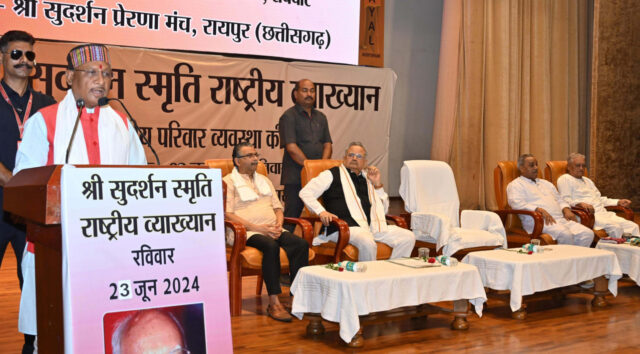 मुख्यमंत्री श्री विष्णु देव साय आज राजधानी रायपुर के दीनदयाल उपाध्याय आडिटोरियम में आरएसएस के पंचम सरसंघचालक स्वर्गीय श्री सुदर्शन जी की स्मृति में आयोजित राष्ट्रीय व्याख्यान में मुख्य अतिथि के रूप में शामिल हुए। ‘‘भारतीय परिवार व्यवस्था की शक्ति’’ विषय पर आयोजित व्याख्यान में मुख्य वक्ता आरएसएस के सह सरकार्यवाह श्री रामदत्त चक्रधर थे। उन्होंने व्याख्यान में कहा कि मूल्य आधारित परिवार व्यवस्था भारत की शक्ति है, परिवार भारत देश की धुरी है। परिवार एक होगा, तो देश एक होगा। दीनदयाल उपाध्याय ऑडिटोरियम में श्री सुदर्शन प्रेरणा मंच द्वारा आयोजित कार्यक्रम की अध्यक्षता मध्यक्षेत्र के संघचालक डॉ. पूर्णेंदु सक्सेना ने की। इस अवसर पर विधानसभा अध्यक्ष डॉ. रमन सिंह और श्री सुदर्शन प्रेरणा मंच के मार्गदर्शक डॉ. राजेंद्र दुबे मंच पर उपस्थित थे।