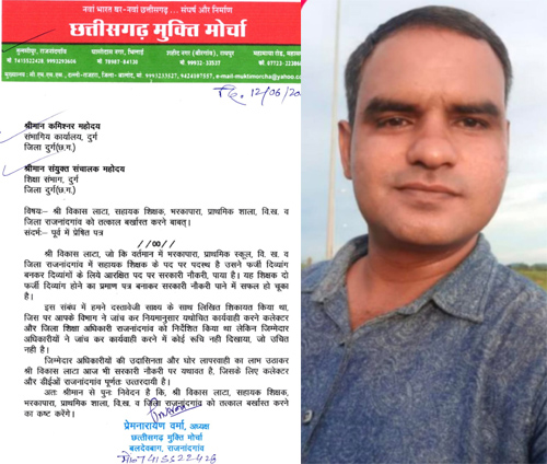 बताया गया कि पूर्व में भी दस्तावेजी साक्ष्य के साथ लिखित शिकायत किया गया था जिस पर विभाग ने जांच कर नियमानुसार यथोचित कार्यवाही करने कलेक्टर और जिला शिक्षा अधिकारी राजनांदगांव को निर्देशित किया था, लेकिन जिम्मेदार अधिकारियों ने जांच कर कार्यवाही करने में कोई रूचि नहीं दिखाया जो उचित नहीं है। जिम्मेदार अधिकारियों की उदासिनता और घोर लापरवाही का लाभ उठाकर विकास लाटा आज भी सरकारी नौकरी पर यथावत है, जिसके लिए कलेक्टर और डीईओं राजनांदगांव पूर्णतः उत्तरदायी है।