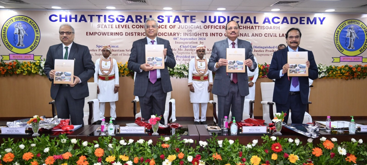 छत्तीसगढ उच्च न्यायालय बिलासपुर में रविवार को जिला न्यायपालिका के सशक्तीकरण व सिविल व आपराधिक विधि पर राज्य स्तरीय कान्फ्रेंस आयोजित किया गया। इस एतिहासिक कान्फ्रेंस के मुख्य अतिथि सर्वाेच्च न्यायालय के न्यायाधीश माननीय श्री न्यायमूर्ति सूर्यकान्त और कार्यक्रम के विशिष्ट अतिथि सर्वाेच्च न्यायालय के न्यायाधीश माननीय श्री न्यायमूर्ति पी. एस. नरसिम्हा एवं माननीय श्री न्यायमूर्ति प्रशांत कुमार मिश्रा रहे। इस कान्फ्रेंस में माननीय उच्चतम न्यायालय के तीन न्यायमूर्तिगणों द्वारा एक साथ भागीदारी किया जाना कान्फ्रेंस की गंभीरता व महत्व तथा भारत की न्यायपालिका के आधारशिला जिला न्यायपालिका की न्यायदान में महत्वपूर्ण भूमिका को रेखांकित करता है।