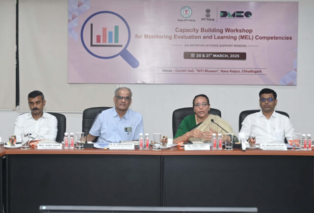 छत्तीसगढ़ में शासन की प्रभावशीलता और योजनाओं की दक्षता को और अधिक सशक्त बनाने के उद्देश्य से राज्य नीति आयोग एवं नीति आयोग (भारत सरकार) के डेवलपमेंट मॉनिटरिंग एंड इवैल्यूएशन ऑफिस (डीएमईओ) के सहयोग से “मॉनिटरिंग एंड इवैल्यूएशन” विषय पर दो दिवसीय कार्यशाला आयोजित की गई। यह दो दिवसीय कार्यशाला 20 और 21 मार्च को आयोजित की जा रही है, जिसमें राज्य सरकार के विभिन्न विभागों के अधिकारियों को आधुनिक निगरानी और मूल्यांकन तकनीकों का प्रशिक्षण दिया जा रहा है।