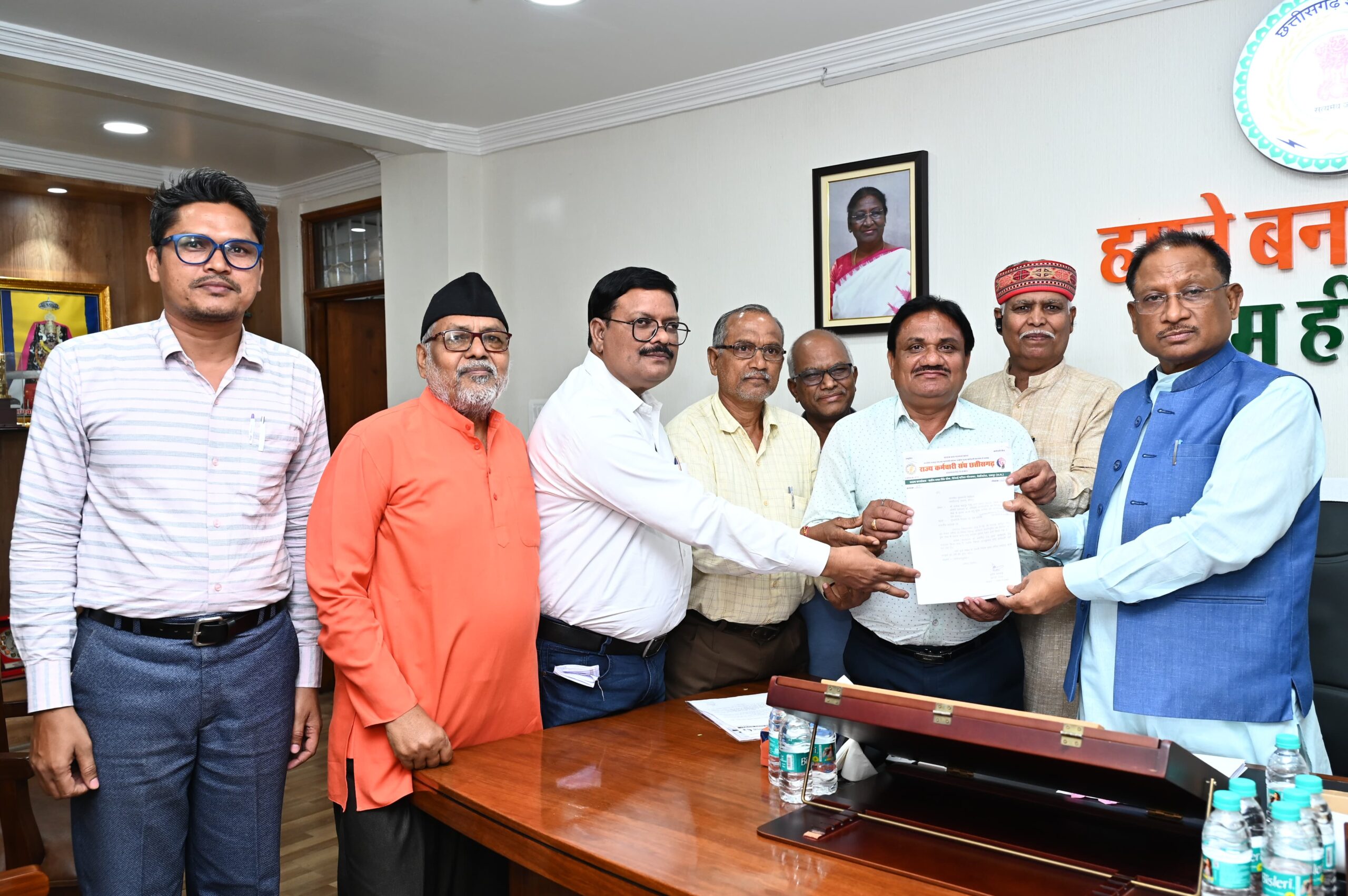 छत्तीसगढ़ शासन द्वारा मान्यता प्राप्त राज्य कर्मचारी संघ छत्तीसगढ़ के प्रतिनिधि मंडल ने प्रदेश महामंत्री ए. के. चेलक के  नेतृत्व में शुक्रवार 6 सितंबर को देर रात माननीय मुख्यमंत्री विष्णुदेव साय जी से मुख्यमंत्री निवास में प्रत्यक्ष भेंट कर ज्ञापन सौंपा तथा राज्य के कर्मचारियों और पेंशनरों को जनवरी, 2024 से लम्बित डीए डीआर देने हेतु शीघ्र निर्णय लेने का आग्रह किया. माननीय मुख्यमंत्री जी ने इस पर संघ प्रतिनिधि मण्डल को आश्वस्त किया कि राज्य में कर्मचारियों और पेंशनरों को डीए डीआर देने के आदेश बहुत जल्द जारी होंगे. राज्य कर्मचारी संघ के प्रतिनिधि मंडल में राज्य कर्मचारी संघ के पूर्व प्रदेश अध्यक्ष वीरेन्द्र नामदेव,  राज्य कर्मचारी संघ के प्रदेश उपाध्यक्ष अरविन्द ओझा एवं प्रमुख कर्मचारी नेता टी आर देवांगन, जी आर बसोने, डा विनोद वर्मा, नागेन्द्र सिंह आदि शामिल थे.