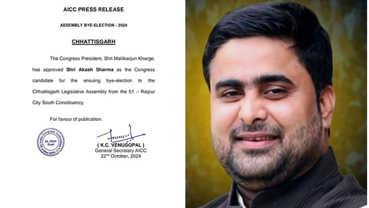 रायपुर। कांग्रेस ने रायपुर दक्षिण विधानसभा उपचुनाव के लिए अपने उम्मीदवार की घोषणा कर दी है। पार्टी ने आकाश शर्मा को इस सीट से टिकट दिया है। आलाकमान ने आकाश शर्मा के नाम पर अंतिम मुहर लगा दी है। इस सीट पर कांग्रेस के आकाश शर्मा का मुकाबला रायपुर के पूर्व सांसद और भाजपा के प्रत्‍याशी सुनील सोनी से है।
