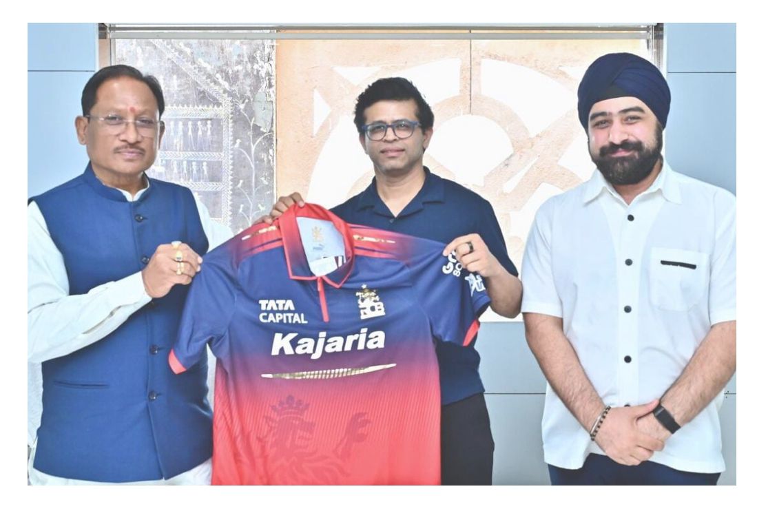 चैलेंजर्स बेंगलुरु (RCB) की ओर से मुख्यमंत्री श्री विष्णु देव साय को टीम का आधिकारिक जर्सी भेंट कर रायपुर में प्रस्तावित आईपीएल मैच के आयोजन के लिए औपचारिक रूप से आमंत्रित किया गया। इस अवसर पर आरसीबी के वाइस प्रेसिडेंट श्री राजेश मेनन तथा भारतीय क्रिकेट कंट्रोल बोर्ड (BCCI) के संयुक्त सचिव श्री प्रभतेज सिंह भाटिया उपस्थित थे।