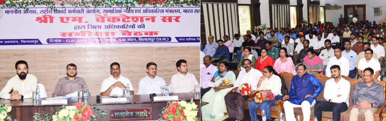 राष्ट्रीय सफाई कर्मचारी आयोग नई दिल्ली के अध्यक्ष श्री एम वेंकटेशन (केन्द्रीय राज्य मंत्री का दर्जा प्राप्त) ने आज बैठक लेकर सफाई कर्मियों की सुरक्षा और समस्याओं के संबंध में अधिकारियों को जरूरी निर्देश दिए। उन्होंने सफाई कर्मचारियों से उनकी समस्याएं विस्तार से जानी। बैठक में कलेक्टर श्री अवनीश शरण, नगर निगम कमिश्नर श्री अमित कुमार, एडीएम श्री शिव कुमार बनर्जी, सहायक कलेक्टर श्री तन्मय खन्ना सहित विभागीय अधिकारी और बड़ी संख्या में सफाई कर्मचारी मौजूद थे।