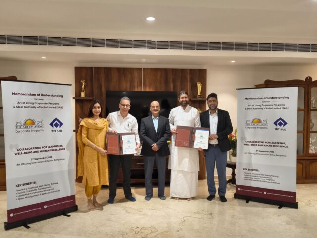 नई दिल्ली, 04 सितंबर, 2025: स्टील अथॉरिटी ऑफ़ इंडिया लिमिटेड (सेल) और आर्ट ऑफ़ लिविंग ने सेल कार्मिकों के बीच Holistic Well-Being को बढ़ावा देने के लिए एक समझौता ज्ञापन पर हस्ताक्षर किया है। इस समझौता ज्ञापन को सेल के निदेशक (कार्मिक) श्री के.के. सिंह की उपस्थिति में, सेल – प्रबंध प्रशिक्षण संस्थान (एमटीआई) के कार्यकारी कार्यपालक निदेशक (मानव संसाधन – ज्ञानार्जन एवं विकास) श्री संजय धर और आर्ट ऑफ़ लिविंग के व्यक्ति विकास केंद्र इंडिया (वीवीकेआई) के अध्यक्ष श्री ब्र. प्रज्ञाचैतन्य ने बेंगलुरु के आर्ट ऑफ़ लिविंग इंटरनेशनल सेंटर में 03 सितंबर, 2025 को हस्ताक्षर किए।
