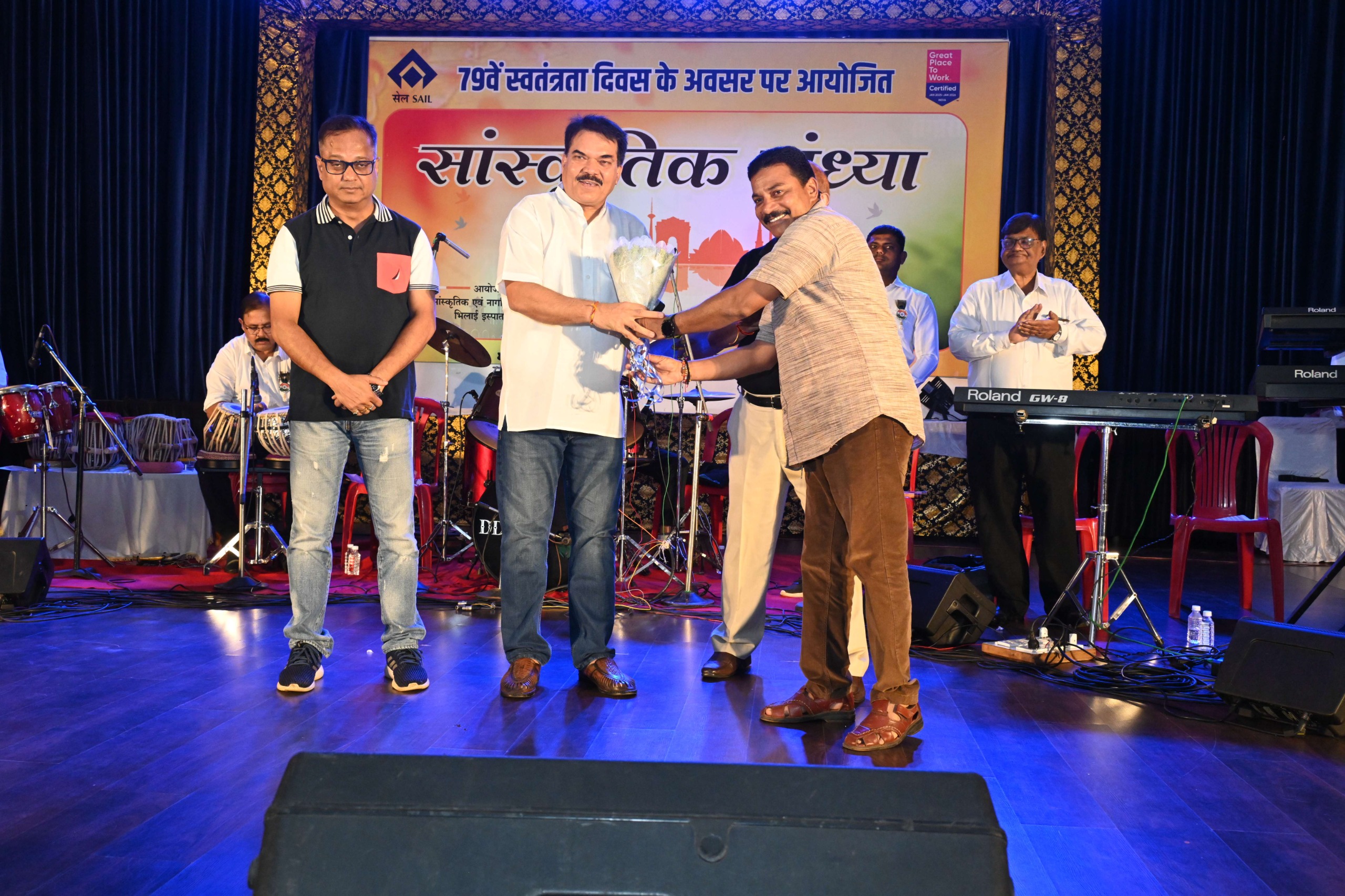 स्वतंत्रता दिवस समारोह की श्रृंखला को सांस्कृतिक रंग प्रदान करते हुए सेल-भिलाई इस्पात संयंत्र के क्रीड़ा, सांस्कृतिक एवं नागरिक सुविधाएं विभाग द्वारा महात्मा गाँधी कला मंदिर में एक मनमोहक संगीत संध्या का आयोजन किया गया। कार्यक्रम में कार्यपालक निदेशक (माइन्स) श्री बिपिन कुमार गिरी, कार्यकारी कार्यपालक निदेशक (मानव संसाधन) श्री संदीप माथुर तथा महाप्रबंधक (मानव संसाधन, ईडी सचिवालय) श्री सौमिक डे ने विशेष अतिथि के रूप में अपनी गरिमामयी उपस्थिति प्रदान की।