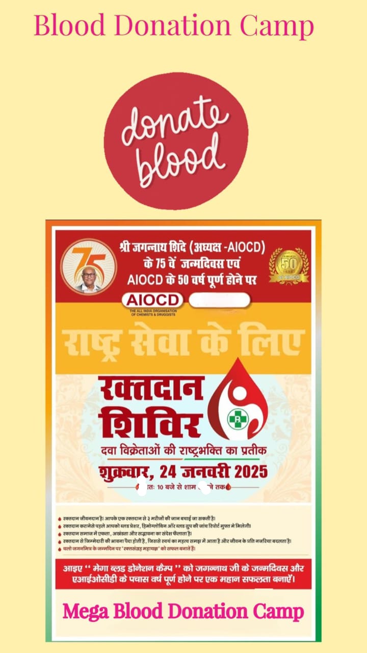 अखिल भारतीय दवा विक्रेता संघ के राष्ट्रीय अध्यक्ष श्री जे एस सिंदे जी के 75वें जन्मदिवस के अवसर पर पूरे भारतवर्ष में 75000 यूनिट ब्लड डोनेशन का लक्ष्य रखा गया है, जिला दवा विक्रेता संघ रायपुर के सचिव श्री लोकेश साहू ने बताया कि छत्तीसगढ़ के सभी जिले के दवा विक्रेता एवं उनके सहयोगी रक्त दान करेंगे.रायपुर जिला के सदस्ययो द्वारा रक्त दान शुक्रवार 24 जनवरी को मॉडल ब्लड सेंटर डॉ भीमराव अंबेडकर स्मृति चिकित्सालय मे सुबह 11:00 बजे से शाम 4:00 बजे तक रक्तदान करेंगे. रक्त दान (जीवन दान )करने वाले सदस्य को अखिल भारतीय दवा विक्रेता संघ एवं छत्तीसगढ़ केमिस्ट एंड डिस्ट्रीब्यूटर संगठन द्वारा सम्मान पत्र देखकर सम्मानित किया जाएगा.